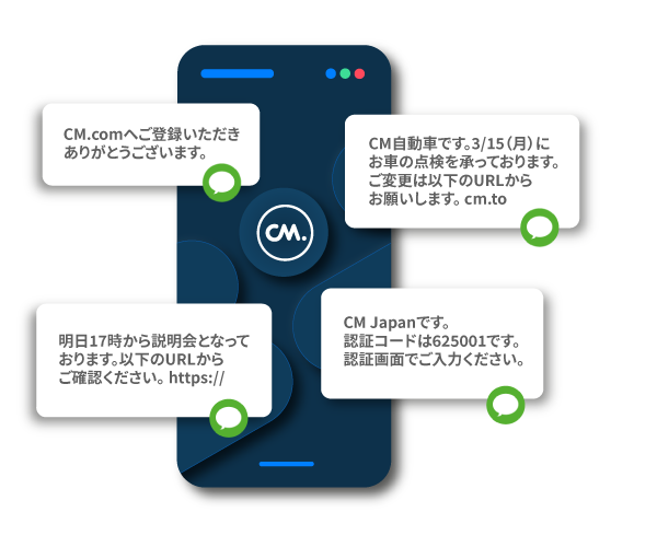 シンプルなAPIでSMS認証が必要なシステムやアプリへワンタイムパスワードや認証コードの自動送信を組み込みでSMSを送信できます。世界1,000社の通信事業者と直接接続できるCM.comのSMS認証サービスを利用して、安心・安全な認証フローを構築できます。