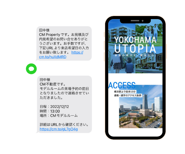 CM.comが提供する「Mobile Marketing Cloud」を利用することで、賃貸契約者とのコミュニケーションや新規物件情報、不動産投資案件、セミナー情報などの案内を効果的にSMSとEメールで行うことができます。