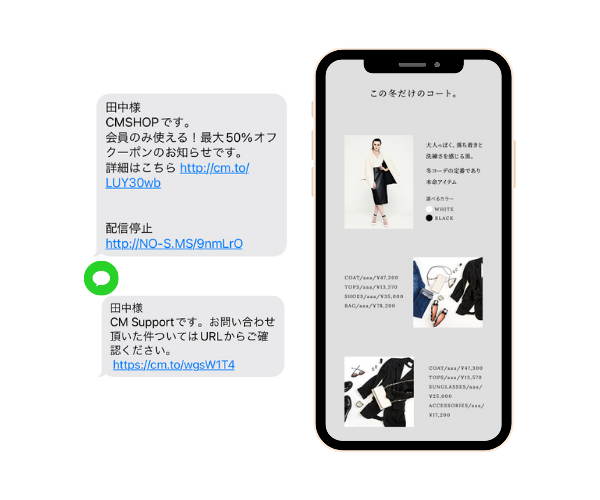 「メールでは読まれない」「電話は繋がらない」とならないように、SMSで新商品や入荷情報を届け、購買を促すコミュニケーションを実現できます。